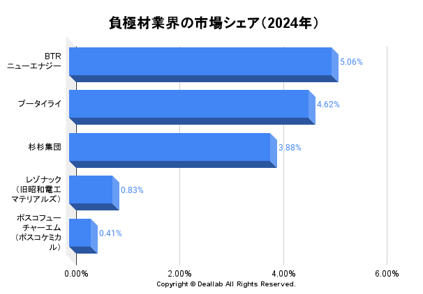 負極材業界の2024年度の売上高⇒参照したデータの詳細情報を分子に、また後述する業界の市場規模を分母にして、2024年の負極材業界の市場シェアを簡易に試算しますと、1位はBTR