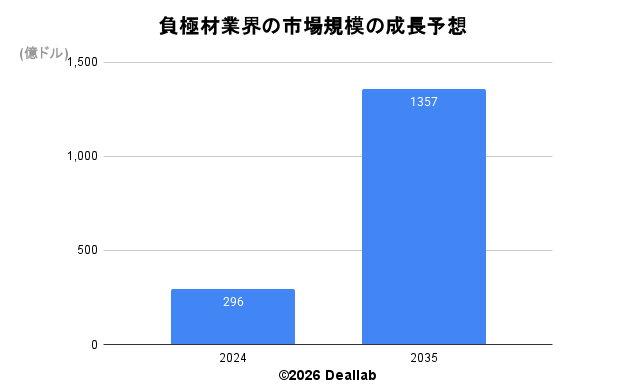 当データベースでは、2024年の負極材業界の市場規模を296億ドルとしております。参照した各種調査データは次の通りとなります。