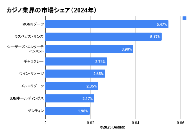 カジノ運営会社各社の2024年度の売上高⇒参照したデータの詳細情報を分子に、また後述する業界の市場規模を分母にして、2024年のカジノ業界の市場シェアを簡易に試算しますと、1位はMGMリゾーツ、2位はラスベガス・サンズ、3位はシーザーズ・エンターテインメントとなります。