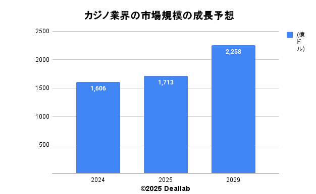 調査会社のビジネスリサーチカンパニーによると、2024年のカジノ業界の市場規模は1,606億ドルです。2025年には1,713億ドルに達し、2025年から2029年にかけて年平均7.2%で成長し、2029年には2,258億ドルに成長すると予想しています。