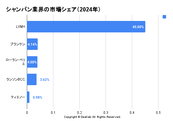 シャンパン業界の2024年度の売上高⇒参照したデータの詳細情報を分子に、また後述する業界の市場規模を分母にして、2024年のシャンパン業界の市場シェアを簡易に試算しますと、1位はLVMH、2位はブランケン、3位はローラン・ペリエとなります。