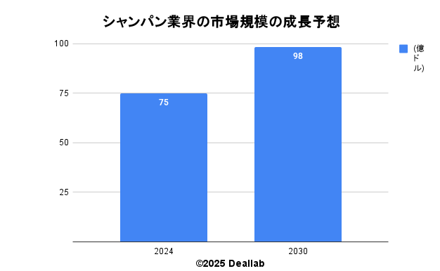当データベースでは、2024年のシャンパン業界の市場規模を75億ドルとしております。参照した各種調査データは次の通りとなります。調査会社グランドビューリサーチによると、2024年の同業界の市場規模は75億ドルです。2030年にかけて年平均4.6%で成長し、規模は98億ドルへと拡大することを見込んでいます。