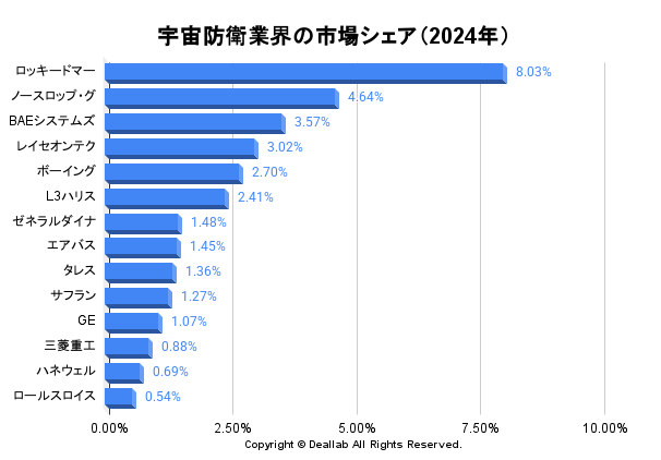 2024年度売上高をベースとした宇宙防衛企業のランキングでは、1位ロッキードマーチン、2位ノースロップ・グラマン、3位BAEシステムズとなっています。