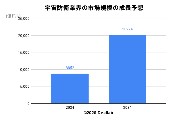当データベースでは、2024年の宇宙防衛業界の市場規模を8,852億ドルとしております。参照した各種調査データは次の通りとなります。
