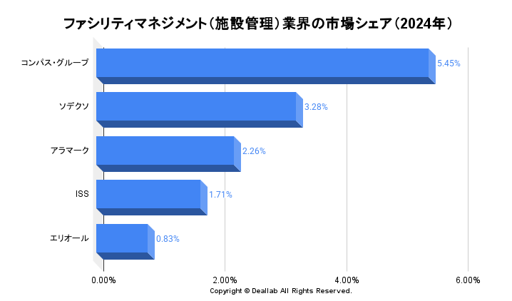ファシリティマネジメント(施設管理)業界の2024年度の売上高⇒参照したデータの詳細情報を分子に、また後述する業界の市場規模を分母にして、2024年のファシリティマネジメント(施設管理)業界の市場シェアを簡易に試算しますと、1位はコンパス・グループ、2位はソデクソ、3位はアラマークとなります。