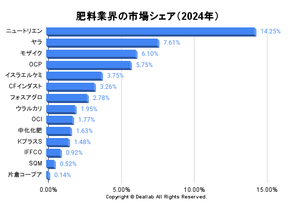 肥料業界の世界シェア、売上高ランキング、市場規模と業界再編の情報を分析しています。ニュートリエン、ヤラ、モザイク、ウラルカリ、ICLグループ(旧イスラエルケミカルズ)といった肥料メーカーの動向も掲載しています。