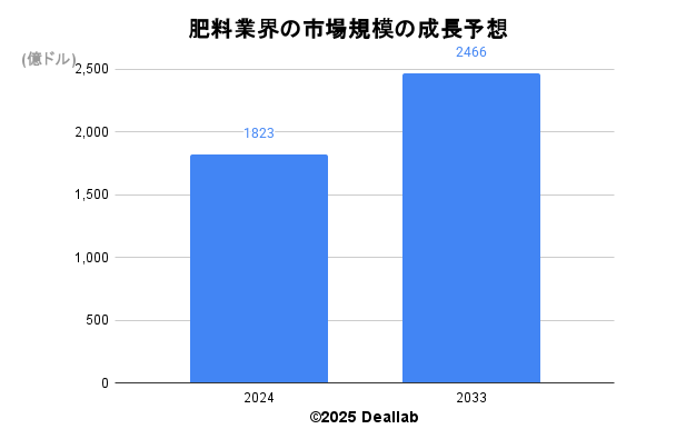 当データベースでは、2024年の肥料業界の市場規模を1,823億ドルとしております。参照した各種調査データは次の通りとなります。