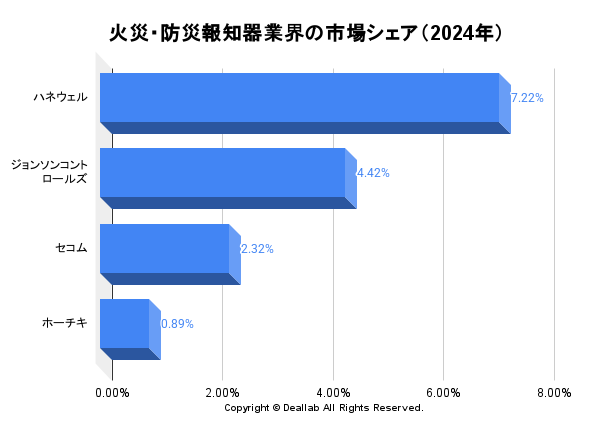火災・防災報知器業界の2024年度の売上高⇒参照したデータの詳細情報を分子に、また後述する業界の市場規模を分母にして、2024年の火災・防災報知器業界の市場シェアを簡易に試算しますと、1位はハネウェル、2位はジョンソンコントロールズ、3位はセコムとなります。