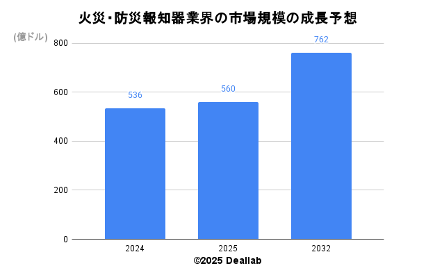 当データベースでは、2024年の火災・防災報知器業界の市場規模を536億ドルとしております。参照した各種調査データは次の通りとなります。