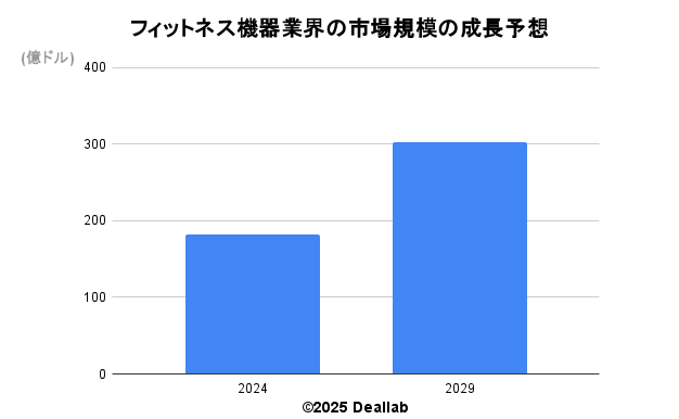 当データベースでは、2024年のフィットネス機器業界の市場規模を182億ドルとしております。参照した各種調査データは次の通りとなります。