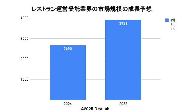 当データベースでは、2024年のレストラン運営受託業界の市場規模を2,690億ドルとしております。参照した各種調査データは次の通りとなります。調査会社インターナショナルマーケットアナライシスリサーチアンドコンサルティンググループによると、2024年の同業界の市場規模は2,690億ドルです。2033年にかけて年平均4.3%で成長し、規模は3,921億ドルへと拡大することを見込んでいます。