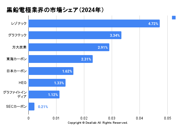 黒鉛電極業界の2024年度の売上高⇒参照したデータの詳細情報を分子に、また後述する業界の市場規模を分母にして、2024年の黒鉛電極業界の市場シェアを簡易に試算しますと、1位はレゾナック、2位はグラフテック、3位が方大炭素となります。