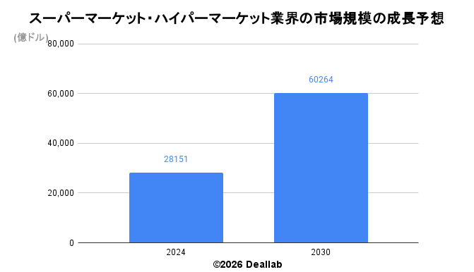 スーパーマーケット・ハイパーマーケット業界の世界市場規模の予想成長推移 ©2024 Deallab