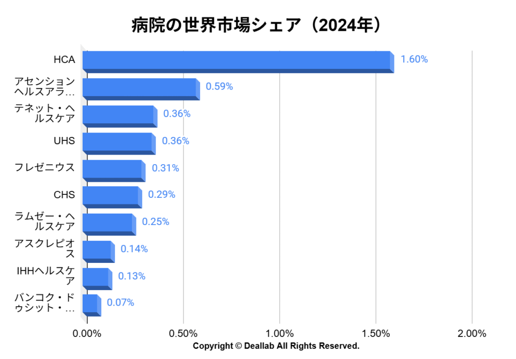 病院の運営会社の世界市場シェアは、米国のホスピタルコーポレーション・オブ・アメリカ(HCA)が首位を堅持しています。2位はアセンションヘルスアライアンス、3位はテネット・ヘルスケア、4位はユニバーサル・ヘルス・システムズ(UHS)となります。5位には、医療機器や治療薬製造も手掛けるドイツのフレゼニウスとなっています。