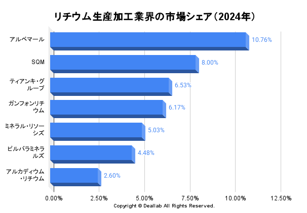 市場シェア1位はアルベマールです。サウスカロライナ州にリチウム処理工場を建設し、水酸化リチウムの生産を開始しました。また、2027年までにノースカロライナ州の新たなリチウム鉱山の操業を開始予定で、リチウム生産能力を拡大し続けています。