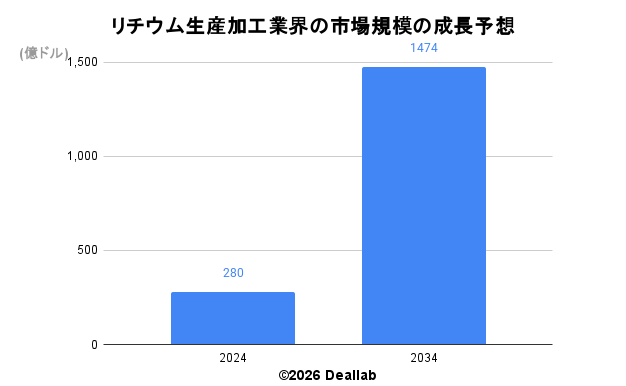 当データベースでは、2024年のリチウム生産加工業界の市場規模を280億ドルとしております。参照した各種調査データは次の通りとなります。