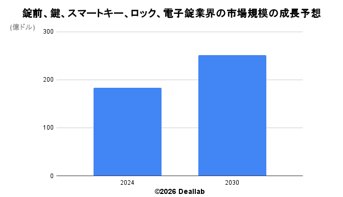 当サ当データベースでは、2024年の錠前、鍵、スマートキー、ロック、電子錠業界の市場規模を208億ドルとしております。参照した各種調査データは次の通りとなります。