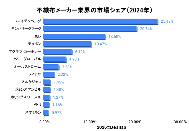 2024年の不織布メーカーランキングでは、ドイツのフロイデンベルグ・グループが市場シェア25.18%で首位を維持しました。同社は自動車、産業用、医療・衛生分野まで幅広い用途向け不織布を展開し、グローバルでの技術力と顧客基盤が強みです。2位は米国のキンバリークラーク(20.54%)で、紙おむつなど衛生用品を軸に不織布の内製化を進める垂直統合モデルが競争力を支えています。3位は日本の東レ(13.60%)で、繊維技術を基盤に高機能不織布をグローバル展開しています。4位にはデュポン(10.47%)が入り、産業・医療用途で存在感を発揮しました。5位以下にはマグネラやベリーグローバル、オールストロームなど欧米勢が並び、上位企業による寡占構造が続く一方、用途別の高付加価値化が競争の軸となっています。