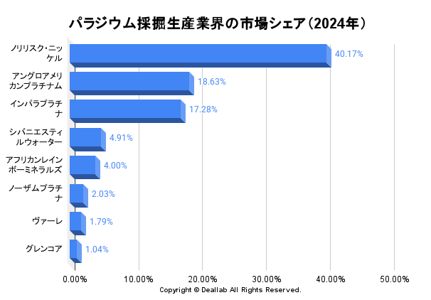 パラジウム採掘生産業界の2024年度の採掘量⇒参照したデータの詳細情報を分子に、また後述する業界の市場規模を分母にして、2024年のパラジウム採掘生産業界の市場シェアを簡易に試算しますと、1位はノリリスク・ニッケル、2位はアングロアメリカンプラチナム、3位はインパラプラチナとなります。