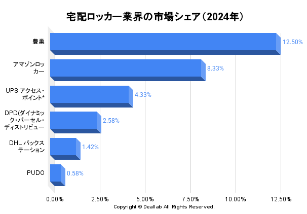 宅配ロッカー業界の2024年度の設置ヵ所⇒参照したデータの詳細情報を分子に、また後述する業界の市場規模を分母にして、2024年の宅配ロッカー業界の市場シェアを簡易に試算しますと、1位は豊巣、2位はアマゾンロッカー、3位はUPS(アクセス・ポイント)となります。
