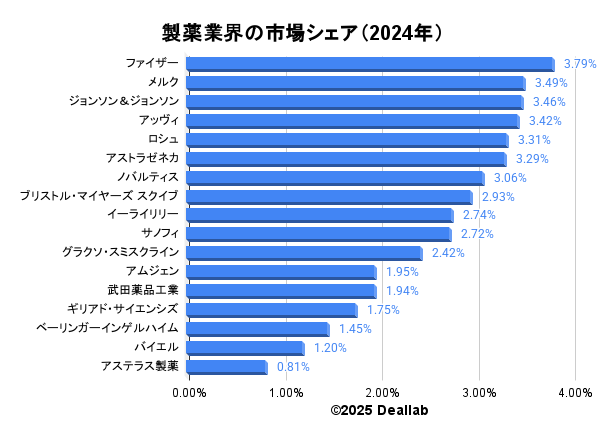 2024年の世界製薬市場では、上位17社の顔ぶれは例年通り米欧大手が中心となり、依然として寡占構造が続いている。市場シェアトップはファイザー(3.79%)で、メルク(3.49%)、ジョンソン&ジョンソン(3.46%)が続き、米国勢3社が上位を独占した。いずれもオンコロジー、免疫疾患、ワクチンなど成長領域に強みを持ち、研究開発投資の規模でも他社を大きく引き離しています。
