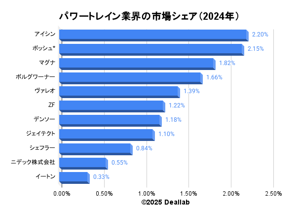 2024年のパワートレイン業界では、日本のアイシンが世界シェア2.20%で首位となり、トランスミッションなど伝達系コンポーネントでの強みを背景にリーディングサプライヤーの地位を維持しています。