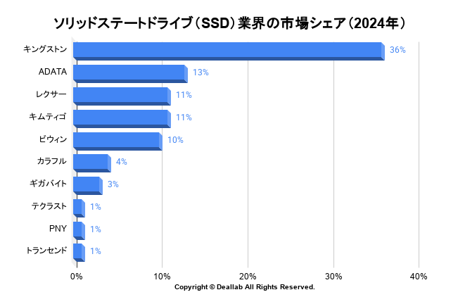 ソリッドステートドライブ(SSD)業界の2024年度の出荷台数シェアは、調査会社のトレンドフォースによると以下の通りとなります。2024年度のソリッドステートドライブ(SSD)業界の市場シェア⇒参照したデータの詳細情報は、1位はキングストン、2位はADATA、3位はレクサーとなります。