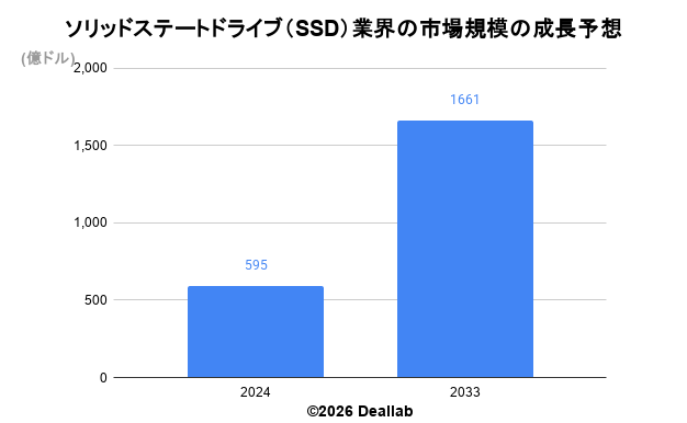 当データベースでは、2024年のソリッドステートドライブ(SSD)業界の市場規模を595億ドルとしております。参照した各種調査データは次の通りとなります。