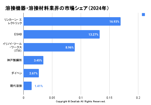 溶接機器・材料業界の世界市場シェアと市場規模について分析をしています。リンカーン・エレクトリック、ESAB、イリノイ・ツール・ワークス、神戸製鋼所といった主要な溶接機器・溶接材料メーカーの概要や動向も掲載しています。