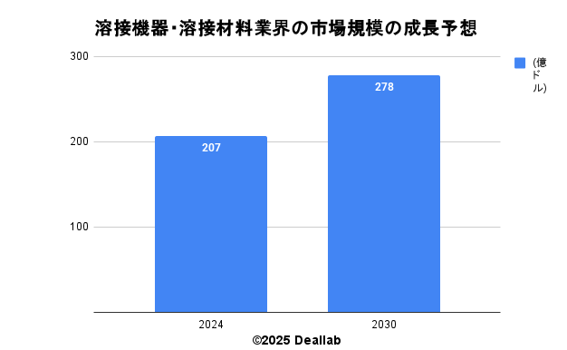 当データベースでは、2024年の溶接機器・溶接材料業界の市場規模を207億ドルとしております。参照した各種調査データは次の通りとなります。調査会社グランドビューリサーチによると、2024年の同業界の市場規模は207億ドルです。2030年にかけて年平均5.1%で成長し、規模は278億ドルへと拡大することを見込んでいます。⇒参照したデータの詳細情報